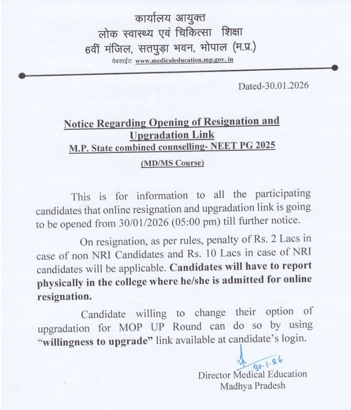 As per the notice, the resignation and upgradation facility will remain active from 30 January 2026 (5:00 PM) until further notice. All eligible candidates who wish to resign from their allotted seat or opt for upgradation in the Mop-Up Round can now access the link through their candidate login on the official counselling portal dme.mponline.gov.in.