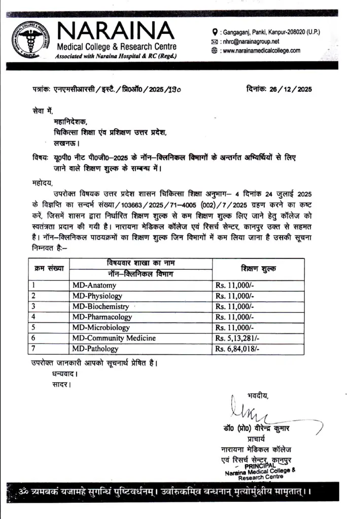NEET PG 2025: Naraina Medical College & Research Centre, Kanpur, has officially notified the Directorate of Medical Education and Training (DMET), Uttar Pradesh, regarding the revised tuition fee structure for non-clinical postgraduate (PG) courses under NEET PG 2025 admissions.