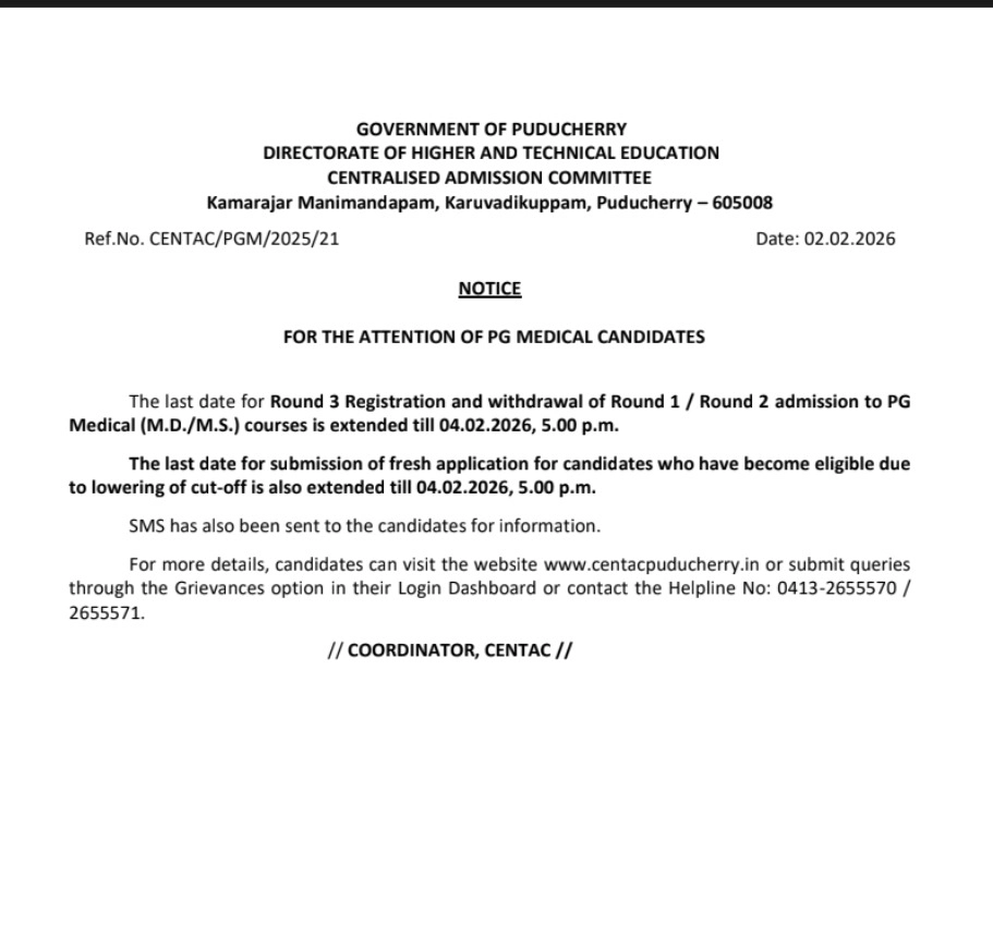 NEET PG 2025 Counselling: The Centralised Admission Committee (CENTAC), Directorate of Higher and Technical Education, Government of Puducherry, has extended the deadline for Round 3 registration and withdrawal for PG Medical admissions (MD/MS) for the 2025 academic session.