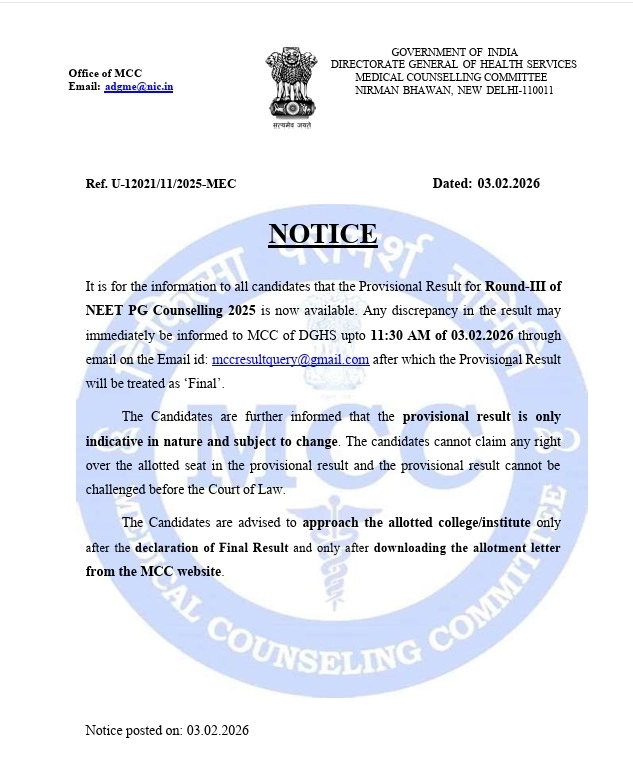 According to the official notice dated February 3, 2026, candidates who have participated in Round III counselling can now check their provisional allotment status on the MCC website.