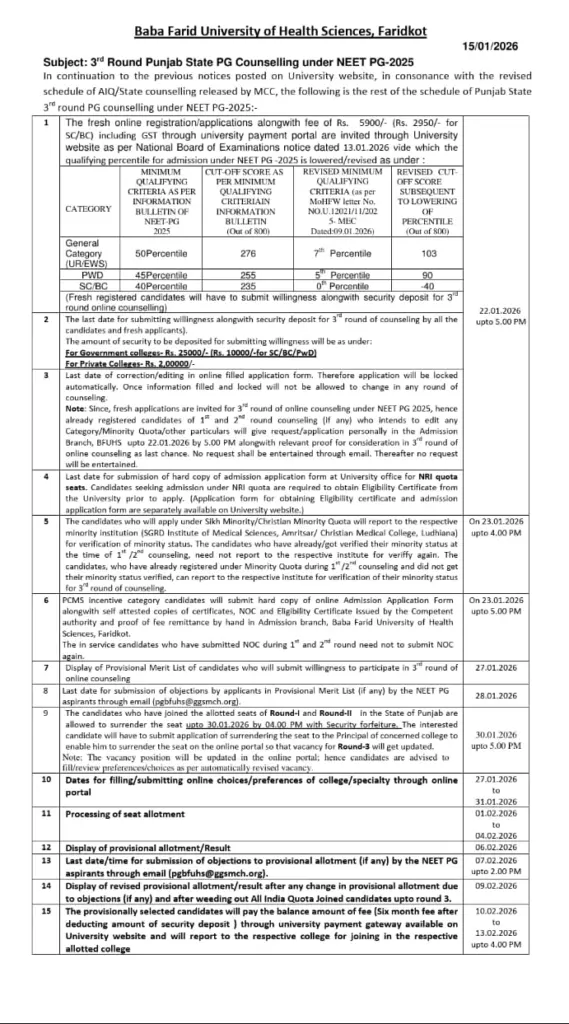 Punjab NEET PG 2025: Baba Farid University of Health Sciences (BFUHS), Faridkot, has released the schedule for the 3rd round of Punjab State PG counselling under NEET PG-2025. This round follows the revised schedule issued by the Medical Counselling Committee (MCC) and includes fresh registrations and submissions for eligible candidates.