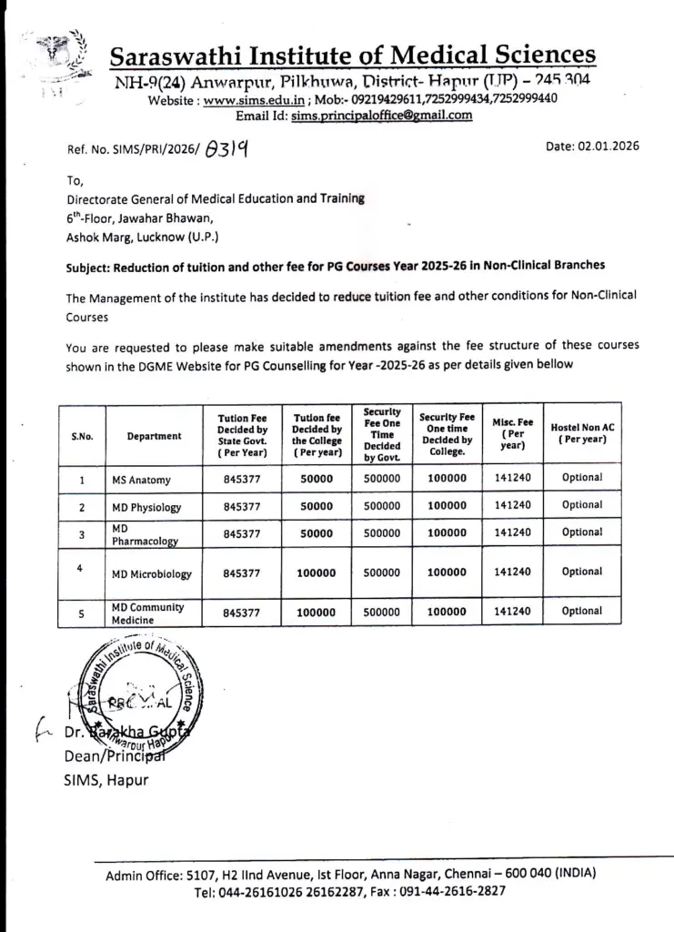 NEET PG 2025: Saraswathi Institute of Medical Sciences (SIMS), Hapur, Uttar Pradesh, has officially announced a reduction in tuition fees and related charges for several non-clinical postgraduate (PG) medical courses for the academic year 2025-26.
