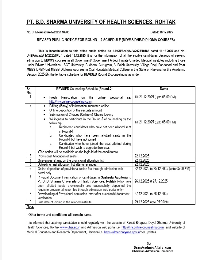 NEET PG Round-2 2025: Pt. B.D. Sharma University of Health Sciences (UHSR), Rohtak has issued a revised public notice for Round-2 counselling of MD/MS, DNB, and Diploma courses for the Academic Session 2025-2026.