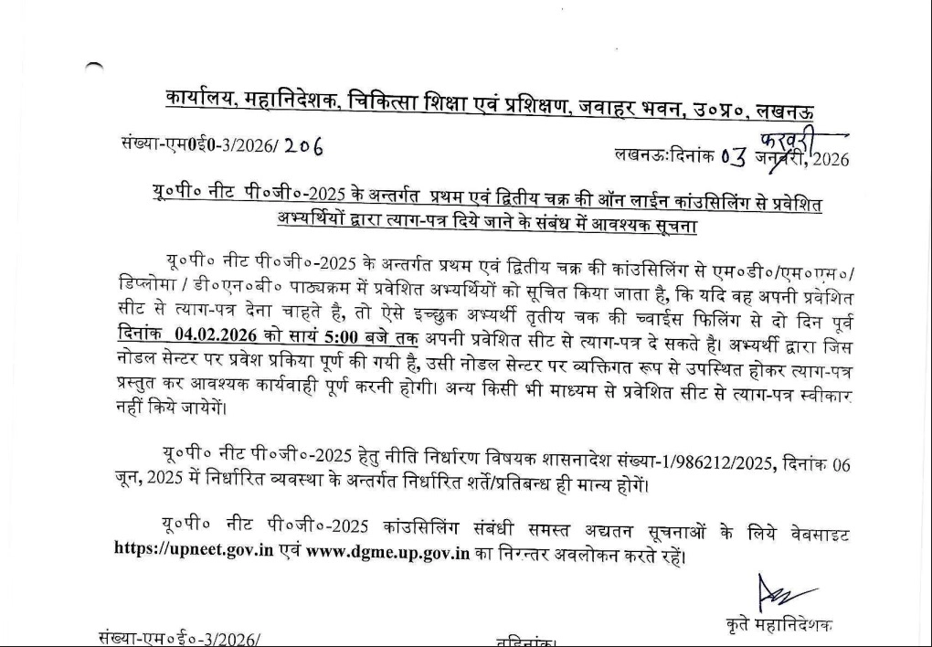 UP NEET PG 2025: The Directorate of Medical Education and Training (DMET), Uttar Pradesh has released an important notice regarding UP NEET PG 2025 counselling. As per the official notification, candidates admitted through Round 1 and Round 2 of online counselling have been given a final opportunity to surrender their allotted seats within the stipulated timeline.
