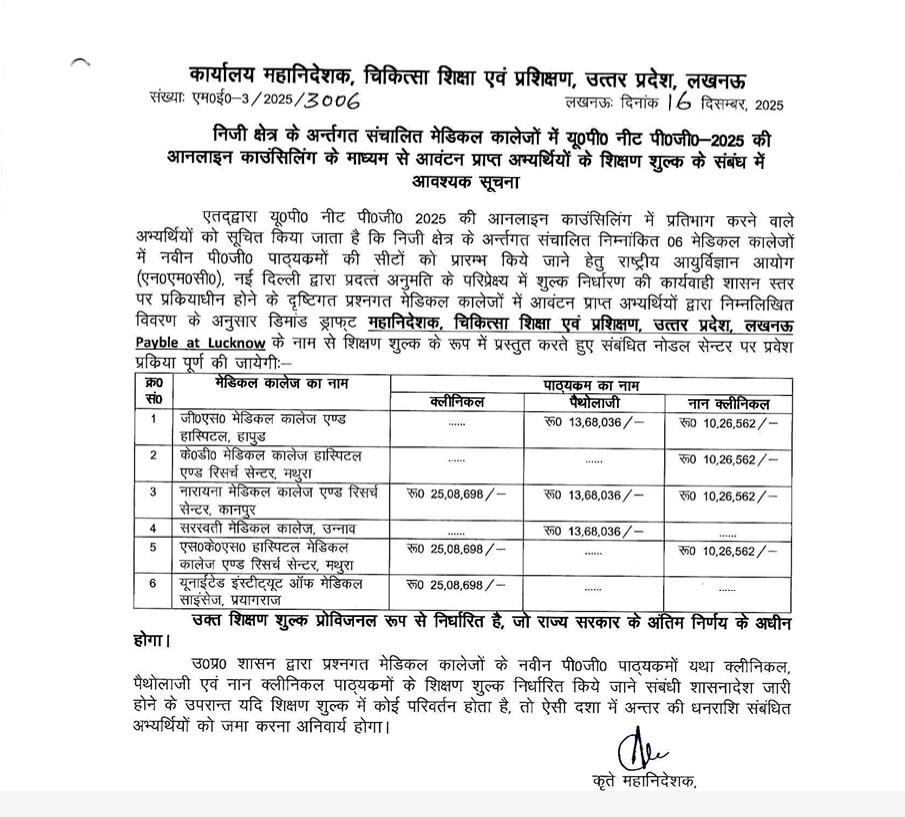 UP NEET PG 2025: The Office of the Director General, Medical Education and Training (DGME), Uttar Pradesh has issued an important notification regarding the fee structure for candidates allotted seats through NEET PG 2025 online counselling in private medical colleges of the state.