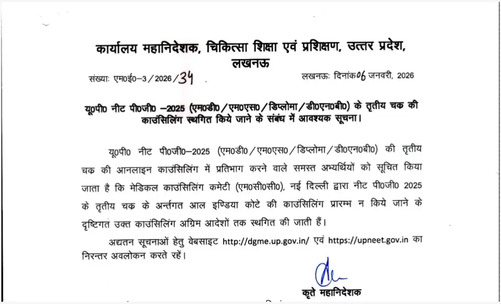 UP NEET PG 2025: The Directorate General of Medical Education and Training (DGME), Uttar Pradesh, has temporarily suspended the third round of counselling for UP NEET PG 2025, according to an official notice issued on January 6, 2026.