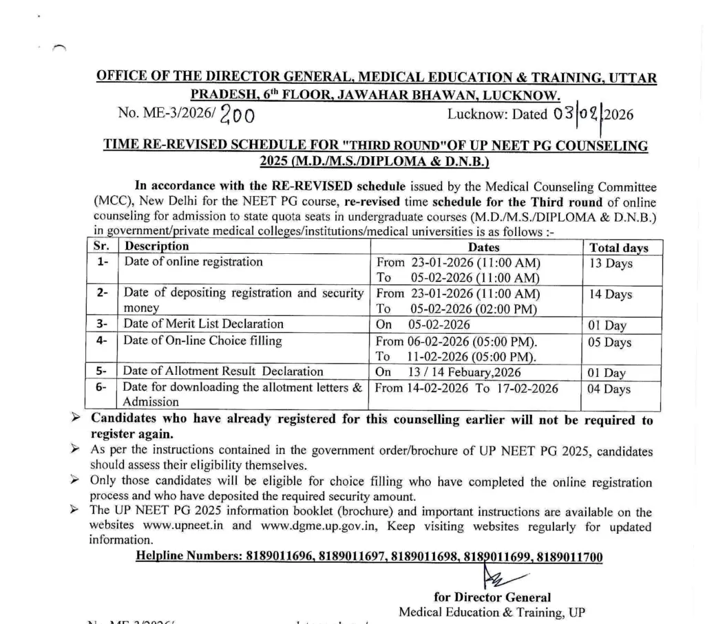 UP NEET PG 2025 Round 3 Counselling: The Office of the Director General, Medical Education & Training (DGME), Uttar Pradesh, has issued a time re-revised schedule for the third round of UP NEET PG 2025 counselling for admissions to MD, MS, Diploma, and DNB courses in government and private medical colleges across the state. The revised notice, dated February 3, 2026, follows the updated timeline announced by the Medical Counselling Committee (MCC), New Delhi.