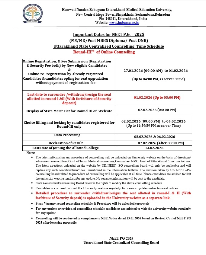 NEET PG 2025: The Uttarakhand State Centralized Counselling Board has officially released the Round-III online counselling schedule for NEET PG 2025 admissions. The counselling will be conducted for MD, MS, Post MBBS Diploma, and Post DNB courses under the supervision of Hemwati Nandan Bahuguna Uttarakhand Medical Education University (HNBUMU).